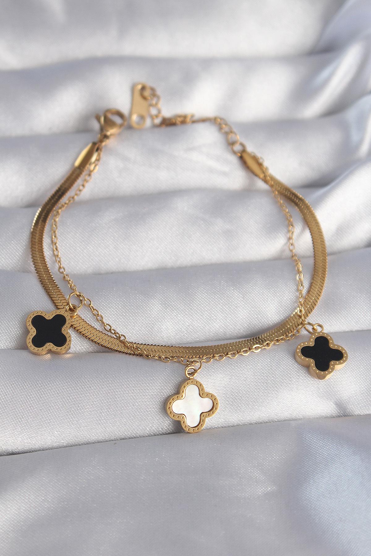 316L Çelik Gold Renk Mineli Yonca Model Çift İtalyan Zincirli Bileklik