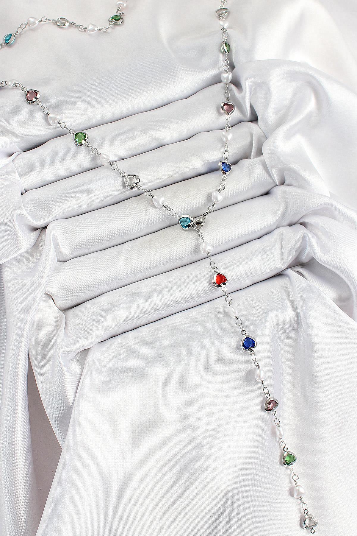 Pirinç Gümüş Renk İncili Zirkon Taşlı Kalpli Y Kadın Kolye