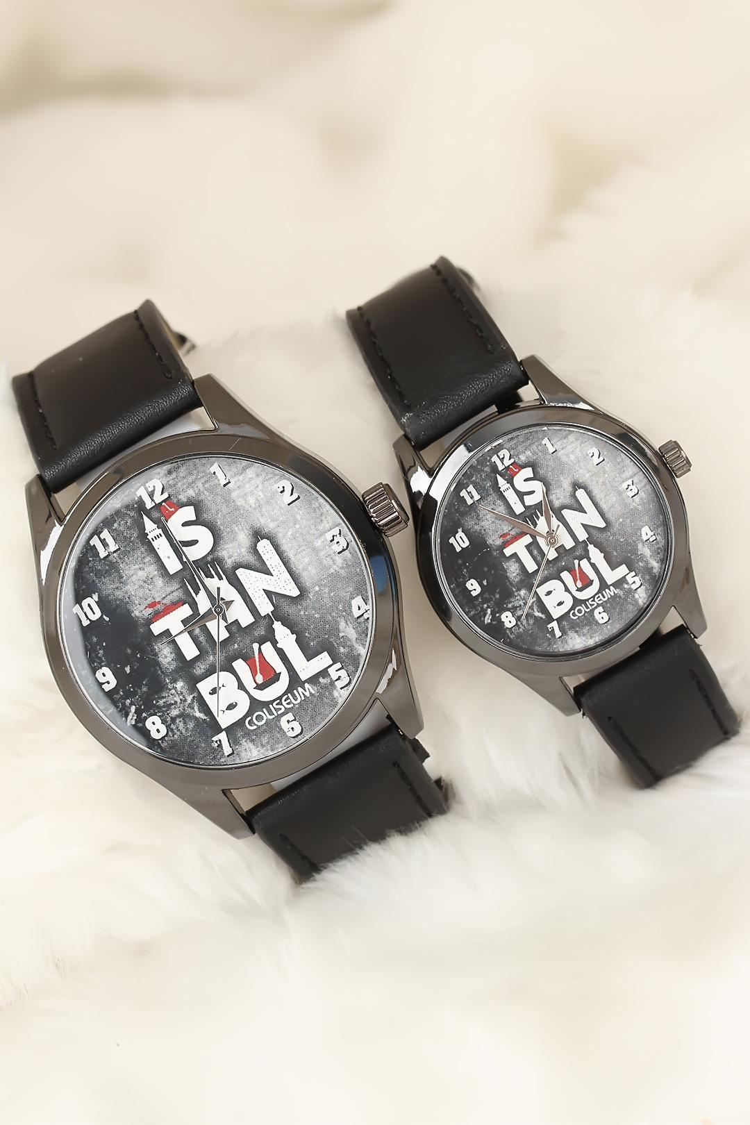 Siyah Renk Deri Kordonlu İstanbul Tasarımlı Sevgili Saatleri