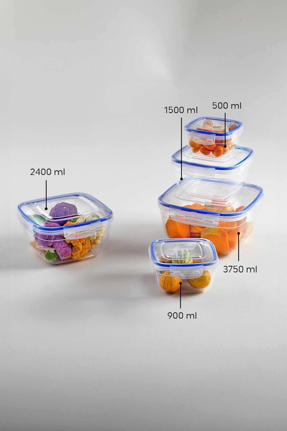 Kare 5 Parça Contalı Vakumlu Sızdırmaz Hava Almaz Saklama Kabı Seti (3750/2400/1500/900/500 Ml)