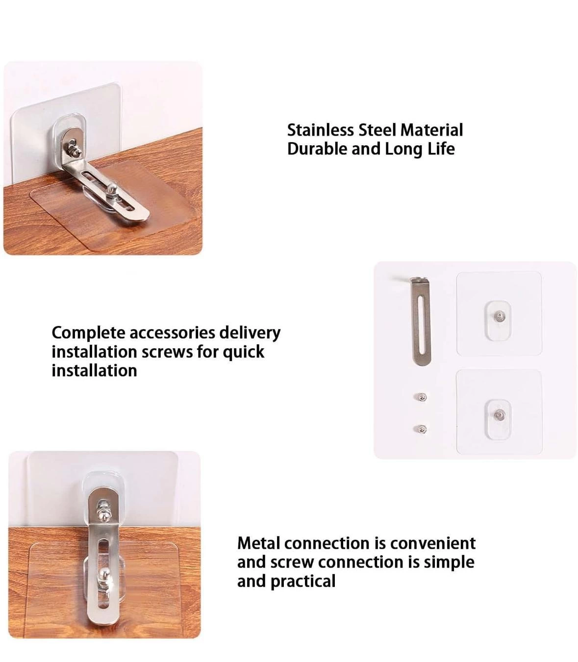 Mobilya sabitleme aparatı ile düşme ve devrilme tehlikesi olan eşyalarınızı sabitleyerek güvenle kullanabilirsiniz Nem ve su geçirmez aparat, yüksek viskoziteli yapışıcılarla zemine tutunur, dayanıklıdır. Kurulumu çok kolay, sabitleme aparatını yapıştıracağınız alanı bir bez ile temizleyin. Yapışkanlı yüzeyleri birbirinden ayırarak duvara ve sabitlemek istediğiniz eşyaya yapıştırın. Sabitleyici kilit ile çeviriniz. Kendiliğinden yapışkanlı sabitleme aparatı deprem ve çocuk koruması sağlar. yüksek kaliteli metal tokalardan güçlü yapışkan çıkartmalardan yapılmış olup kurulumdan sonra çok sağlam olup uzun yıllar kullanabilirsiniz yerine sabitlenmiş mobilyaların güvenliğini ve sağlamlığını etkili şekilde arttırmaktadır. her türlü mobilya gardırop kitaplık tv dolabı şifonyer gibi vb gibi geniş bir kullanım alanında kullanabilirsiniz 1 demek = 2 vidalı yapışkan ve 1 metal parçadan oluşmaktadır