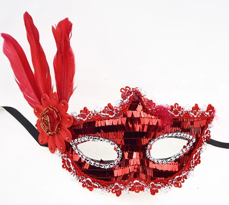 Kırmızı renk yandan tüylü payetli parti maskemiz: