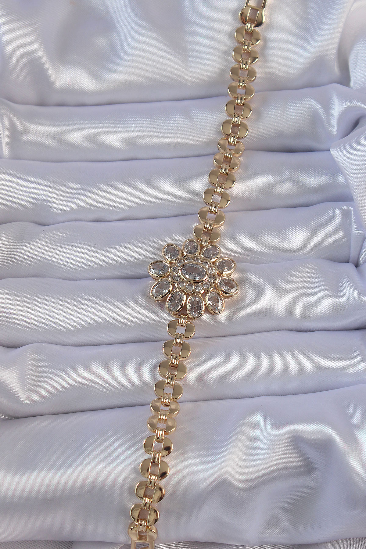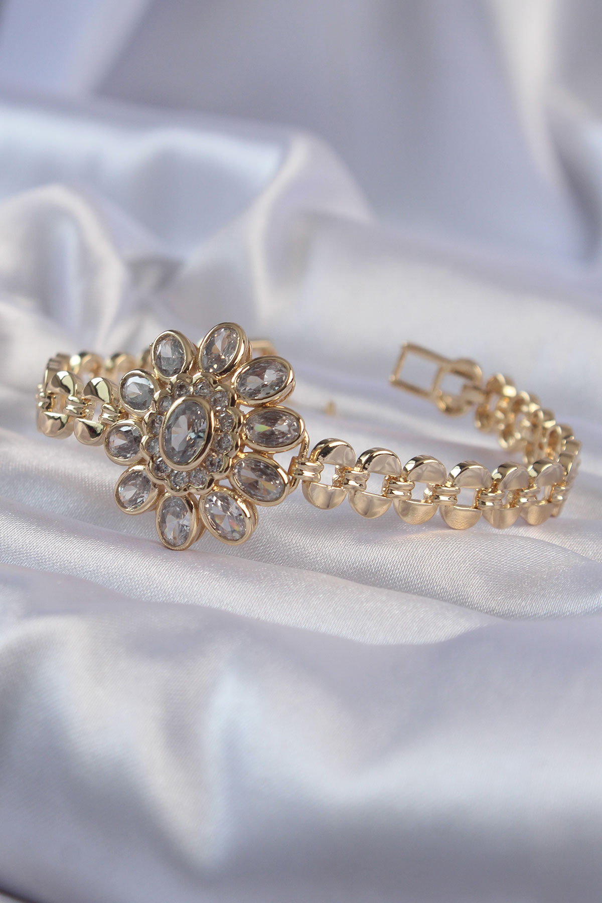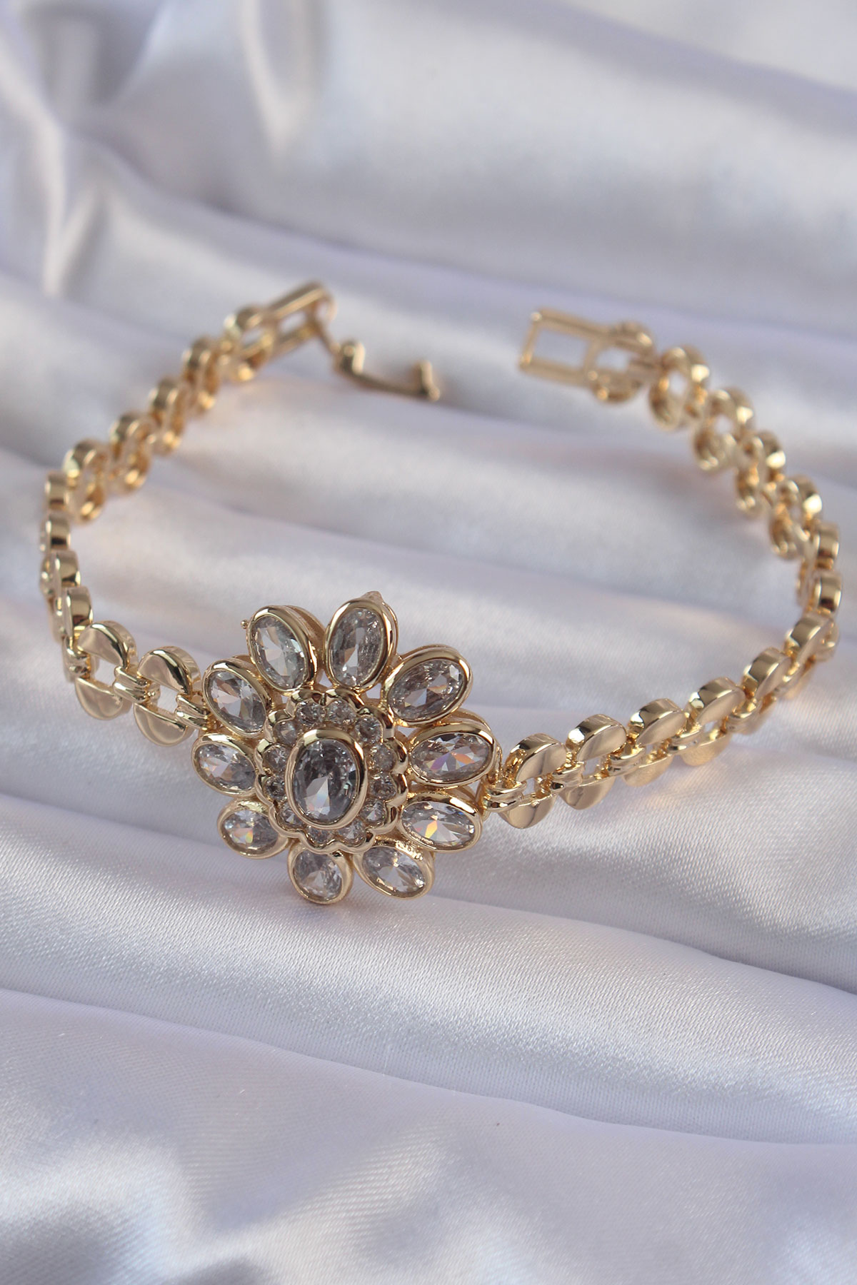 Pirinç Gold Renk İri Zirkon Taşlı Çiçek Figürlü Bileklik