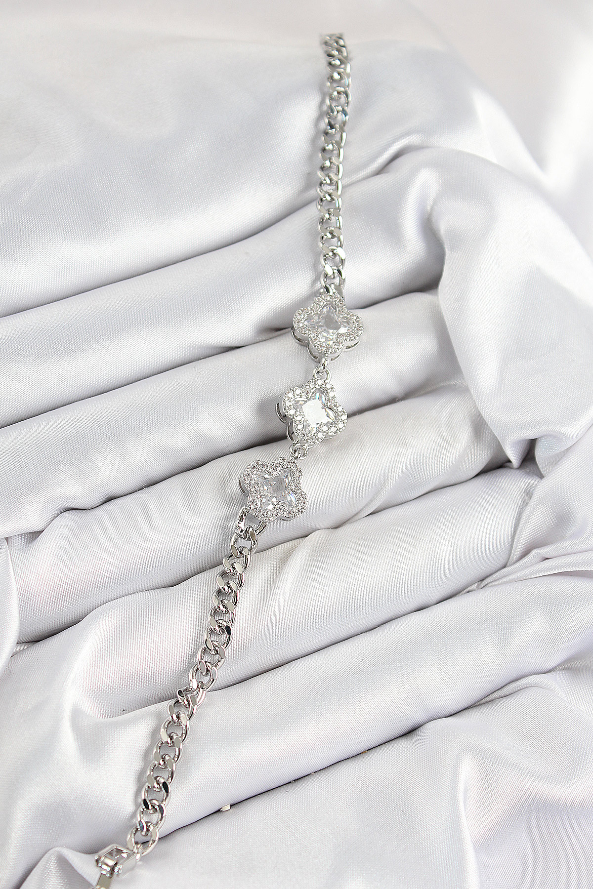 Pirinç Zirkon Taşlı Yonca Model Gümüş Renk Kadın Bileklik