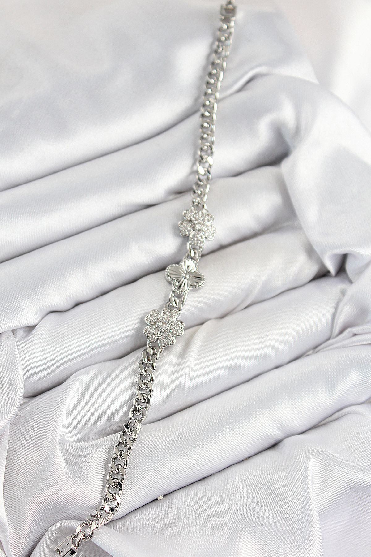 Pirinç Zirkon Taşlı Yonca Model Gümüş Renk Kadın Bileklik