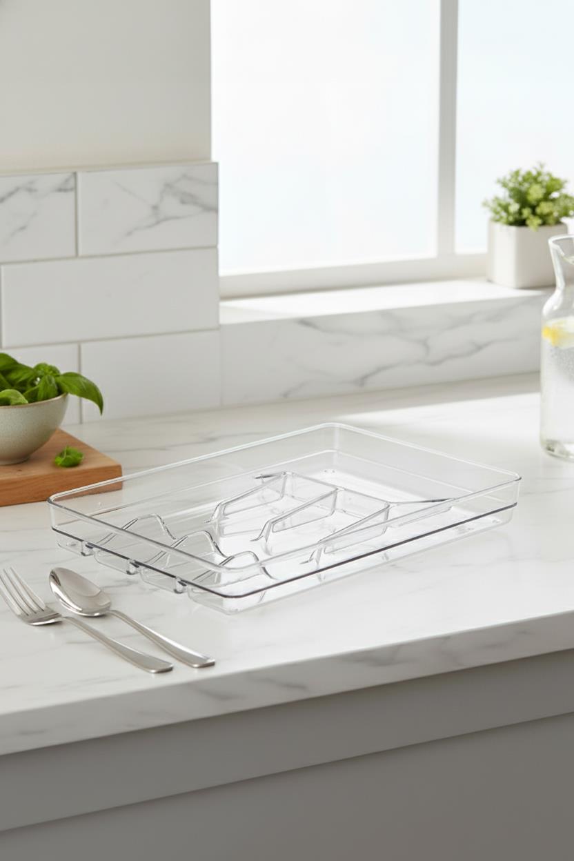 Ürün Hikayesi: Mutfak çekmecelerinde düzeni korumak artık çok kolay! Şeffaf akrilik raf içi kaşıklık, çatal, bıçak ve kaşıklarınızı düzenli bir şekilde saklamanıza yardımcı olur. Şık tasarımı sayesinde hem sade hem de mo...